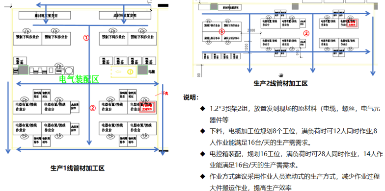 u 電氣裝配接線工位可2人同時一臺機,對面作業,可節省作業空間,年產量達5000臺時,最少排10個工位,年產量達3300臺時,最少排6個工位,