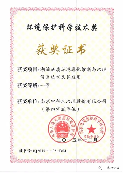 2015年,中科水治理技術獲得國家環保部頒發的環境保護科學技術一等獎。