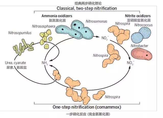 這個理論最先是由俄國微生物界傳奇維諾格拉斯基 (Sergei Winogradsky)早在19世紀末“成功”展示,他分離出了負責這兩步硝化的微生物,也就是所謂的AOB(ammonia oxidizing bacteria)和NOB(nitrite oxidizing bacteria)。但這個超過100年歷史的教條在2015年圣誕節(jié)前被英國明星科學(xué)雜志《自然》上的兩篇同日發(fā)表的題目雷同的文章和隨后一篇在美國微生物學(xué)會的文章終結(jié)了。三個科學(xué)團隊發(fā)現(xiàn)了三種不同的培養(yǎng)[1,2]和一種非培養(yǎng)細菌[3]能夠各自進行從氨氮到硝態(tài)氮的完全硝化過程。